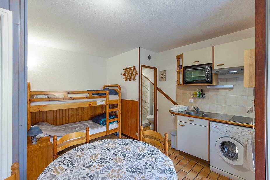 Ce logement dispose d'une chambre séparée avec un lit en 140x190, ainsi qu'une alcôve avec 2 lits superposés en 90x190.
