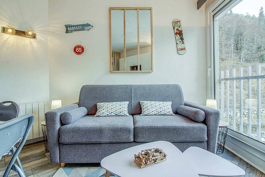 Séjour avec baie vitrée exposition EST, 1 canapé convertible rapido 140, TV écran plat, chaine HiFi.