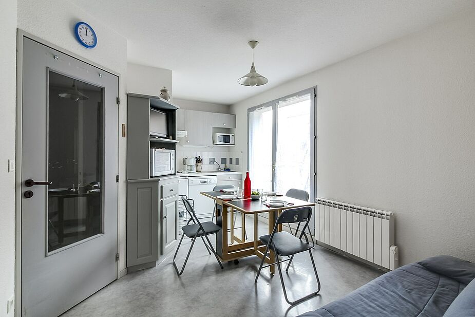 Séjour avec canapé gigogne, TV, kitchenette qui s’ouvre sur le balcon avec : frigo, four, four micro-ondes, lave-vaisselle, 4 plaques électriques.