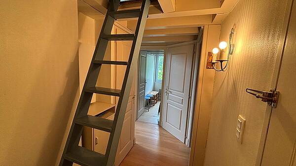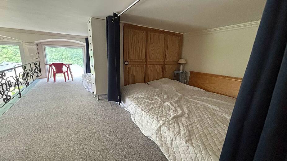 L’accès à la mezzanine se fait par une échelle meuniere. Vous y trouverez deux lits de 140 × 190 cm. ATTENTION : la hauteur sous plafond ne permet pas de se tenir debout et la mezzanine ne convient pas aux enfants de moins de 6 ans.