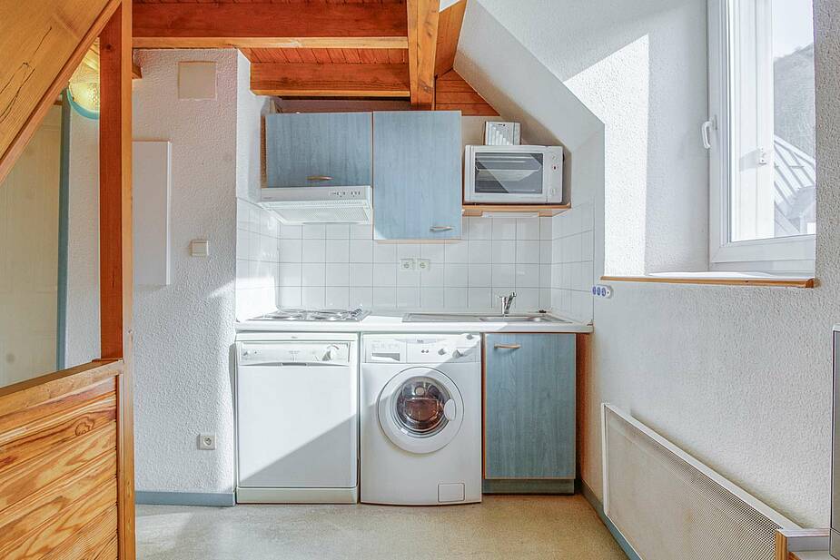 Kitchenette avec frigo, four, Micro-ondes grill, Lave-linge et lave-vaisselle.