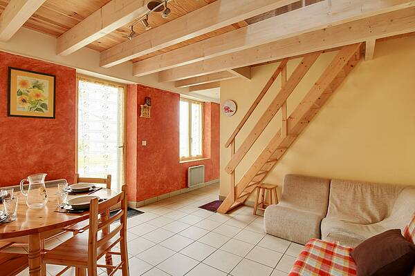 Séjour équipé d’un téléviseur d’un clic clac et d’un espace repas.
