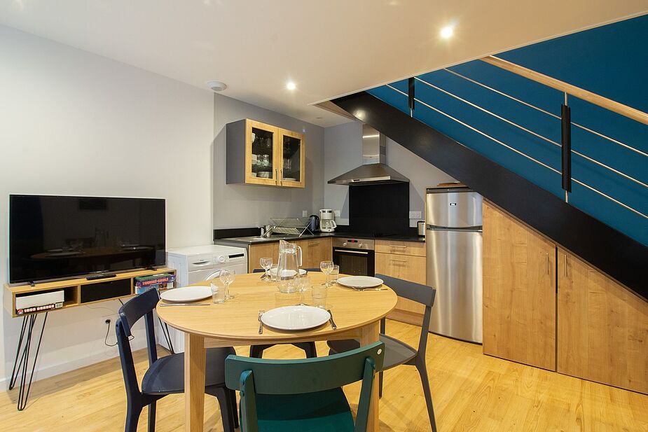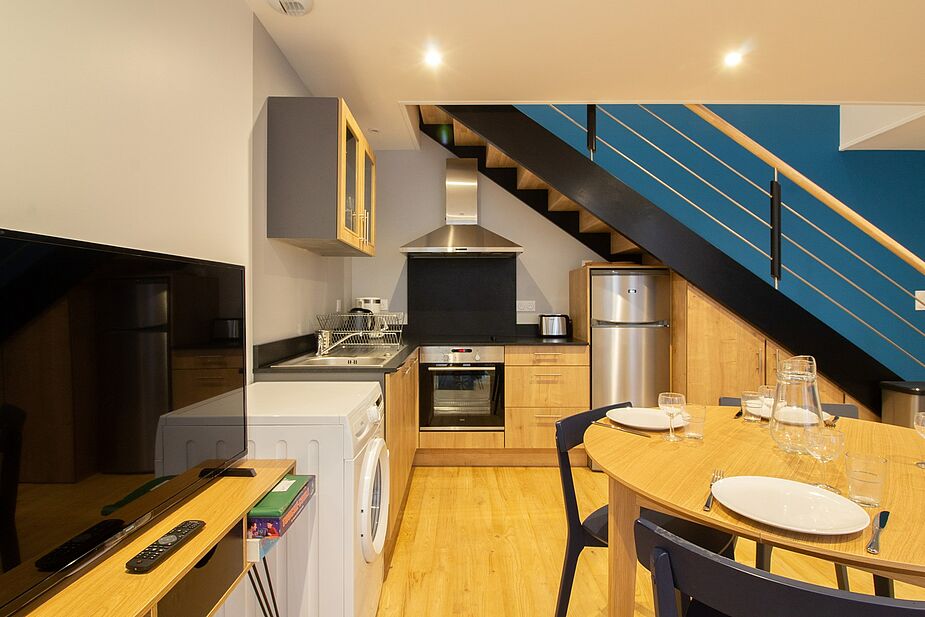 Au rez-de chaussée une cuisine ouverte : four, micro-ondes, frigo, appareil à raclette, cafetière filtre, bouilloire, grille pain, lave-vaisselle, lave-linge.