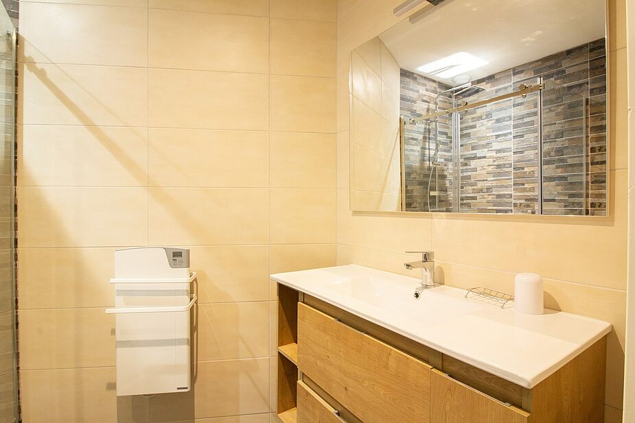 Salle de bain avec douche, sèche-serviette, sèche-cheveux et toilettes.
