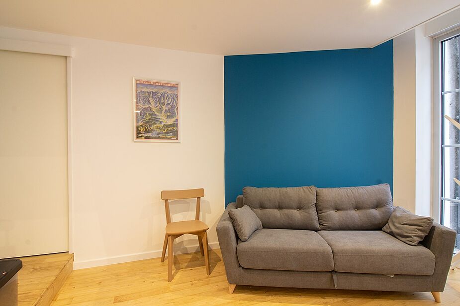 Séjour avec canapé convertible matelas couchage pour deux personnes, télévision.