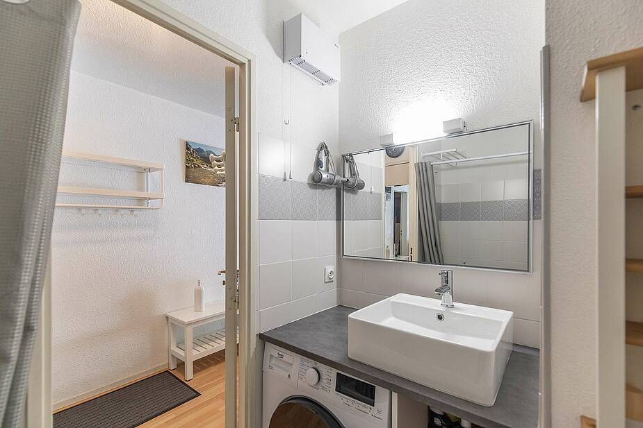 Salle de bain avec lave-linge/sèche-linge et toilette.
