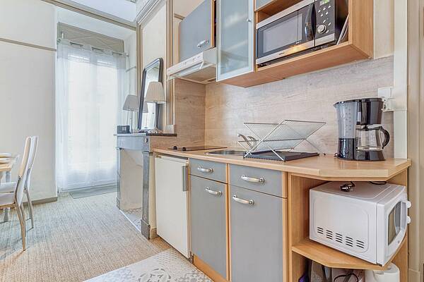 Cuisine ouverte bien équipée: plaque de cuisson, réfrigérateur, micro-onde, grille-pain, bouilloire, cafetière-filtre, senseo, appareil à raclette, sèche-cheveux.