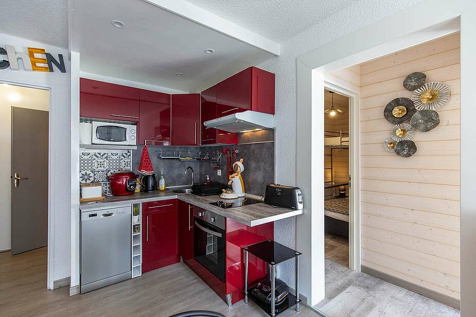 Un coin cuisine aux équipements modernes et aux couleurs chaleureuses vous permettra de vous sentir comme chez vous. Attenant à celui-ci un grand cellier accueille le réfrigérateur grande capacité.