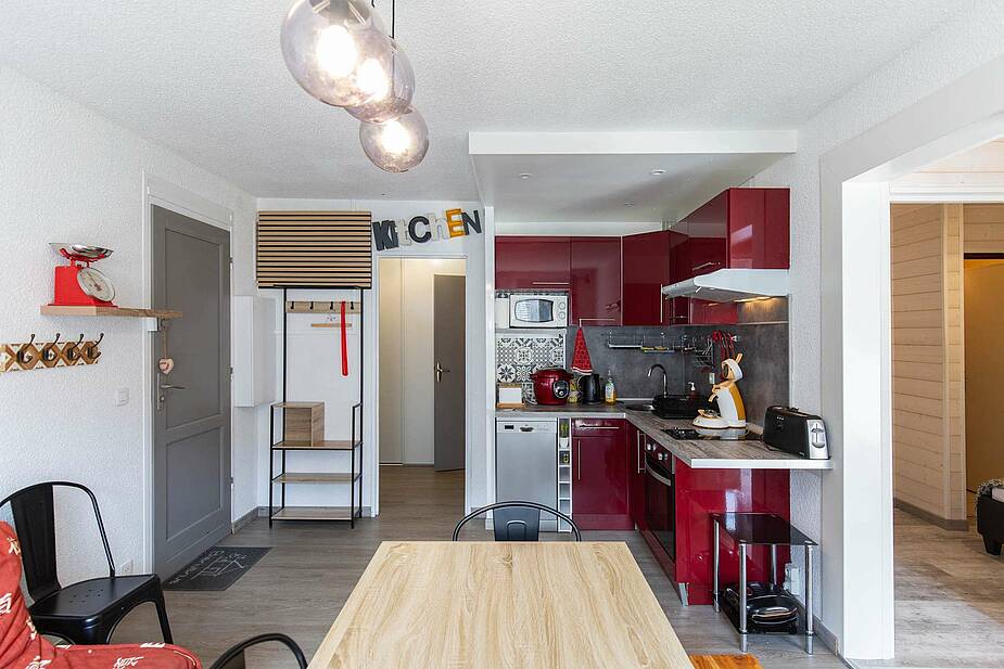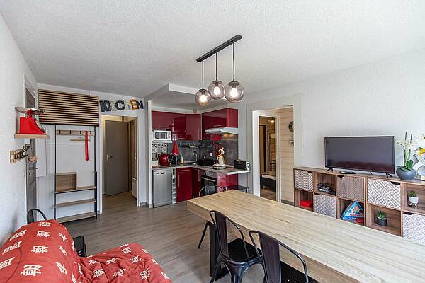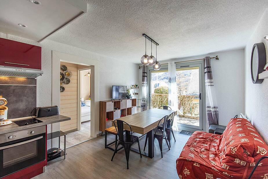 Après avoir franchi un premier cellier vous permettant d'entreposer vos affaires de randonnées ou de ski, vous aurez accès au salon doté d'une table pouvant accueillir 8 personnes et d'un canapé convertible. la baie vitrée vous offre une vue remarquable sur la vallée et le massif montagneux.