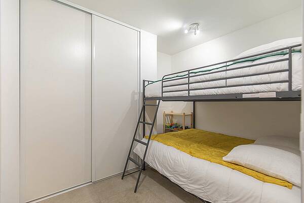 Après vous être stationné sur votre place de parking privative, vous accédez tout d'abord à une grande alcôve bien isolée où se trouve un placard de rangement et deux lits superposés en 140 cm.