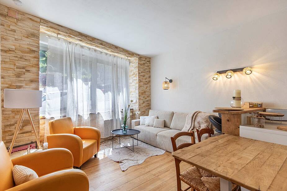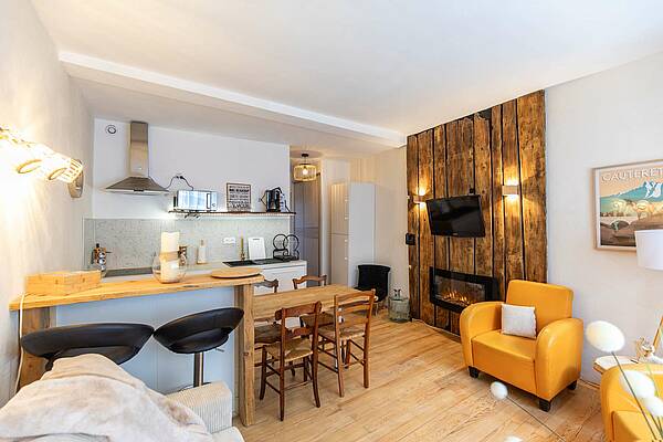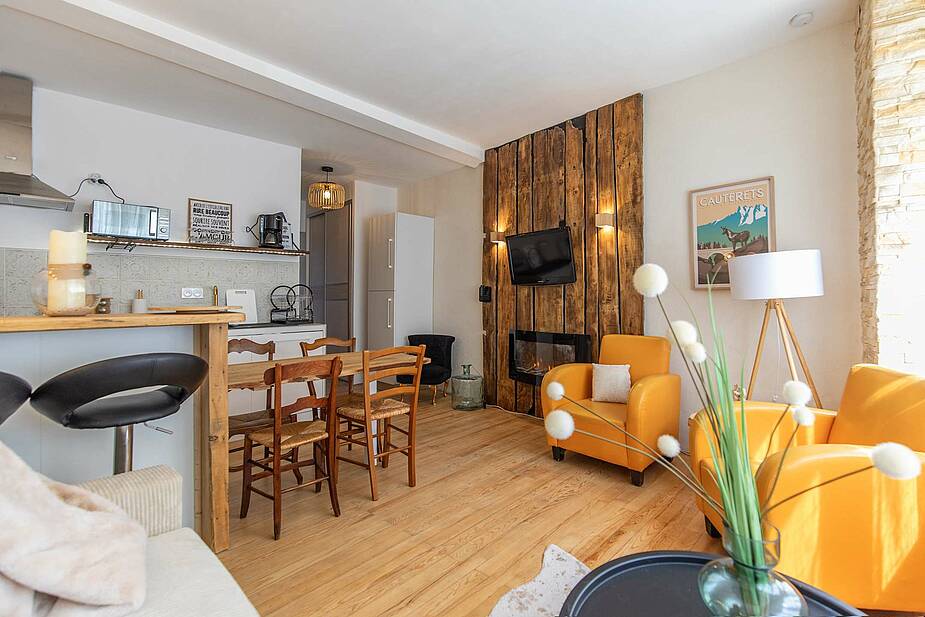 Vous avez ensuite accès au salon qui dispose d'un téléviseur, d'une cheminée électrique de deux fauteuils cuir et d'un canapé convertible.
