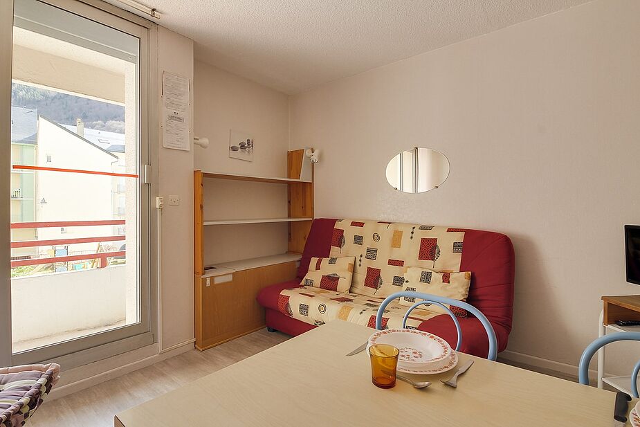Séjour équipé d’un téléviseur et d’un clic-clac pour deux personnes et deux lits 90 superposés dans l’entrée.