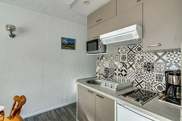 Kitchenette attenante au séjour avec plaques vitro-céramique (2 feux),lave-linge, four, cocotte minute, cafetière.
