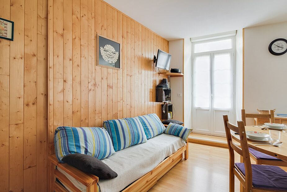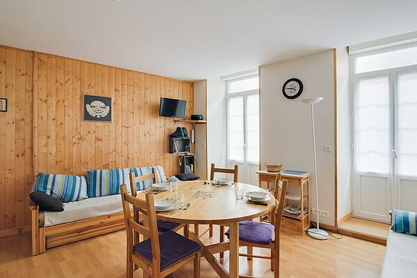 Deux pièces, un séjour avec un espace kitchenette entièrement équipé avec lave- vaisselle, micro-ondes, petit électroménager, deux banquettes transformables en couchage 2 personnes.