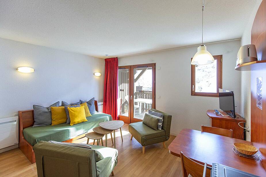 Studio 2/3 couchages, surface de 28 m² avec terrasse, exposition sud. Séjour équipé d'un canapé lit en 160 (2x80) 2 chauffeuses individuelles pour enfants de -1.50m, coin repas, tv. Coin cuisine dans séjour avec plaques vitro céramiques, micro-ondes multifonctions, lave-vaisselle, appareil à raclette, cafetière senséo et mini-four. Salle de bain avec toilettes. Sol en lino. Studio non fumeur. Casier à ski en RDC.