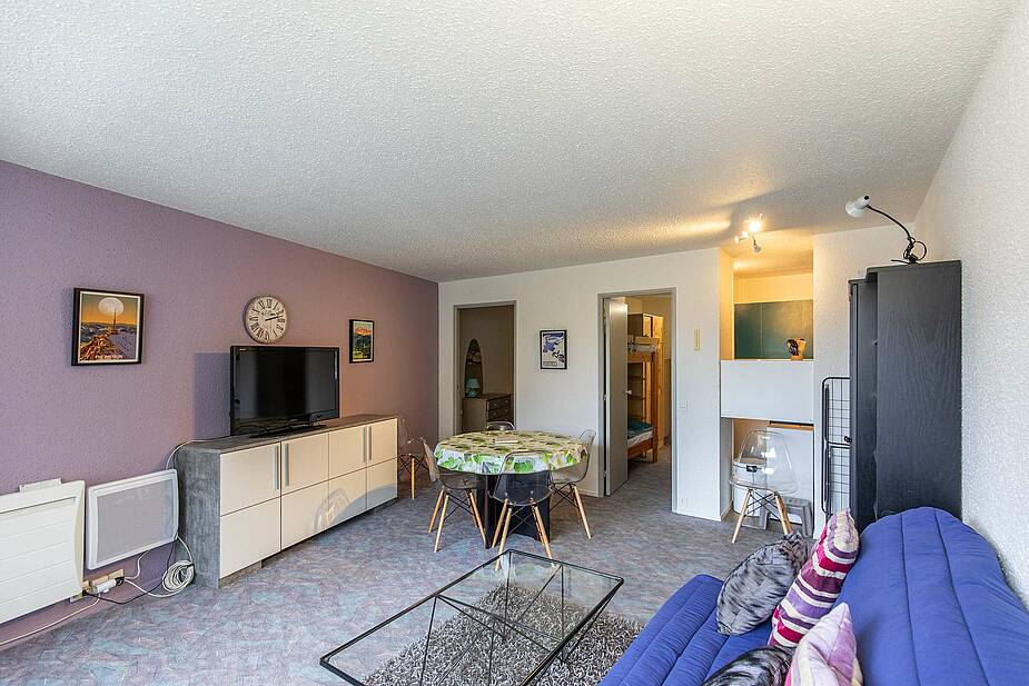 Situé au 5ème étage (accès résidence par escaliers, 23 marches), appartement d'une surface de 42 m² avec balcon, exposition Ouest (vue station, pistes). Séjour équipé d’un téléviseur, d’un canapé lit pour deux personnes en 140. Coin nuit en entrée avec 1 lit superposé (2 x 80). Une chambre (sans fenêtre) avec un lit en 140 cm. Sol moquette. Kitchenette ouverte sur séjour, plaques induction 4 feux, micro-ondes multifonctions, frigo, grille- pain, bouilloire, cafetière à filtre et appareil à raclette. Salle de bain et toilettes séparées. Appartement non fumeur. Casier à ski en RDC.