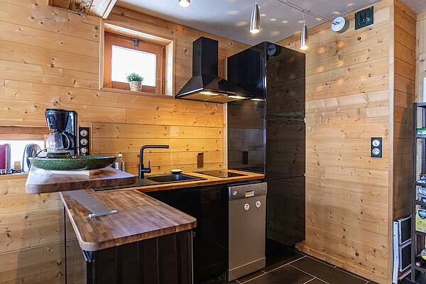 Cuisine ouverte sur le salon avec 2 plaques vitro céramiques, micro-ondes multi fonction, grand réfrigérateur avec congélateur, lave vaisselle, cafetière nespresso, grille pain et appareil à raclette.
