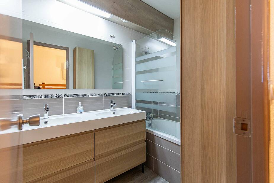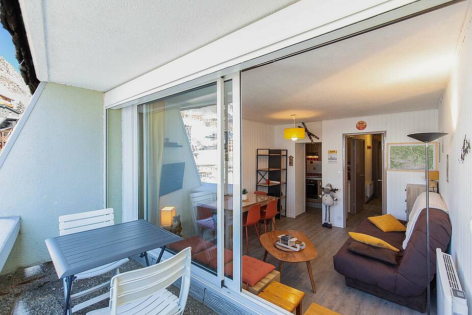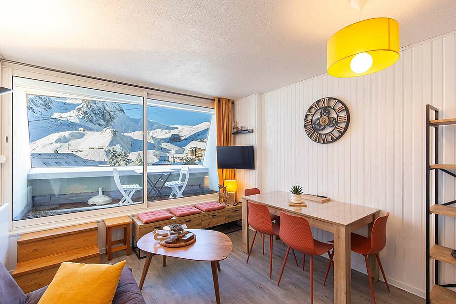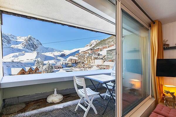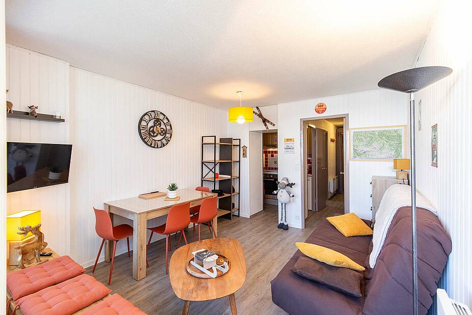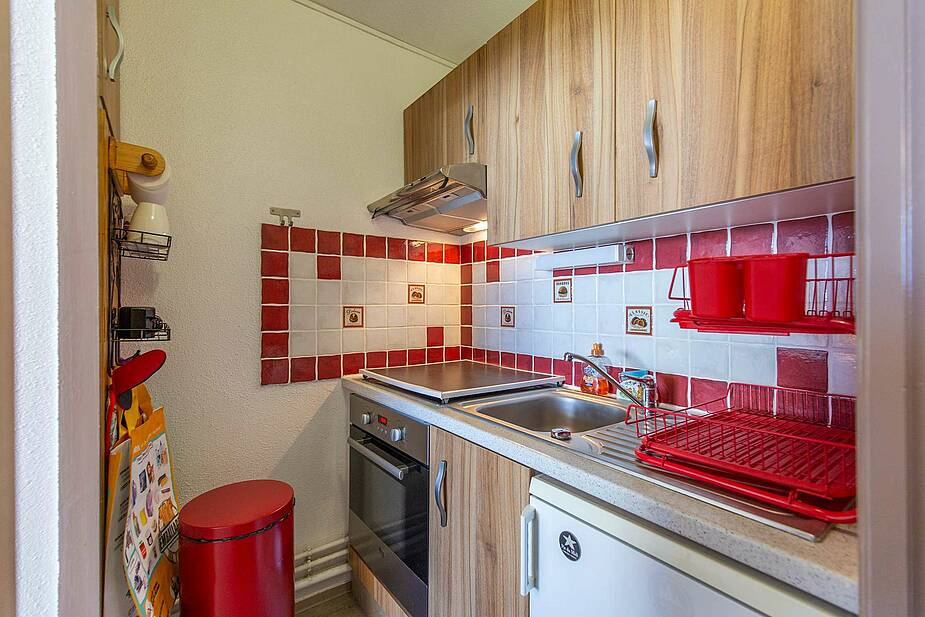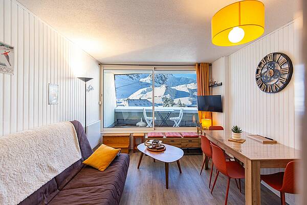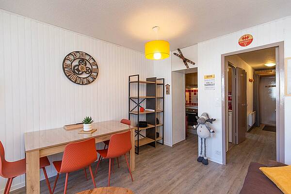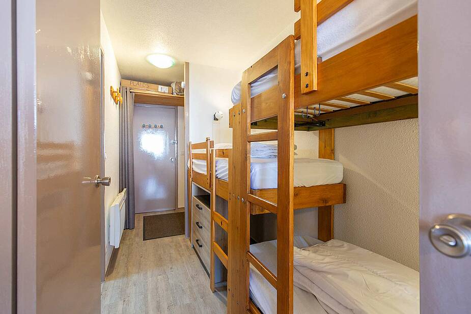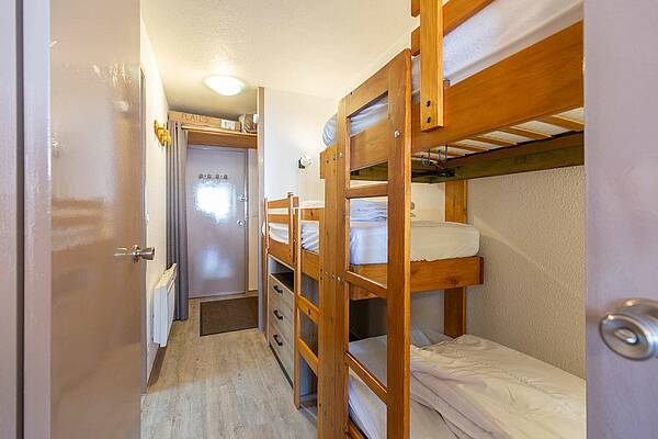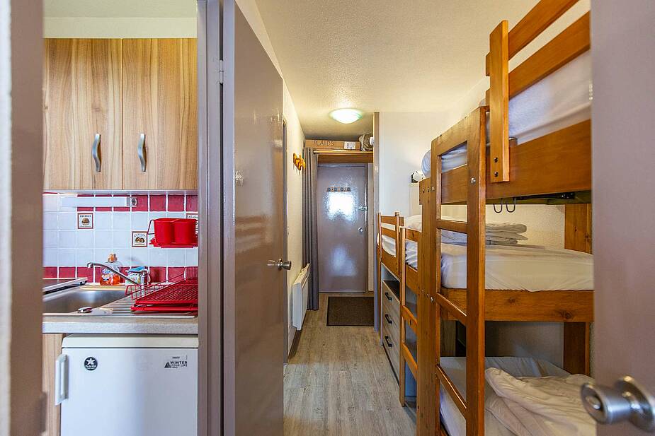 Appartement situé au 5ème étage avec ascenseur, surface de 30m² avec balcon, exposition Ouest (vue station sur les pistes). Séjour équipé d’une télévision, d’un canapé clic clac deux personnes. Coin cabine avec trois lits superposés en 70cm. Sol en parquet stratifié. Kitchenette ouverte sur séjour, avec plaques de cuisson halogène, micro-ondes, four, frigo 120 litres, grille-pain cafetière à filtre et Senseo et appareil à raclette. Salle de bains comprenant : une baignoire et un lavabo double vasques, sèche-cheveux. Toilettes séparées. Casier à ski en RDC.