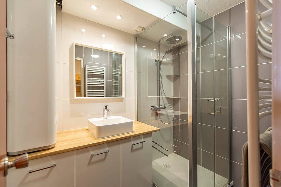 Salle de bains comprenant : une douche et un lavabo. Toilettes séparées.