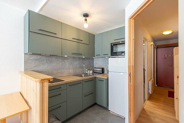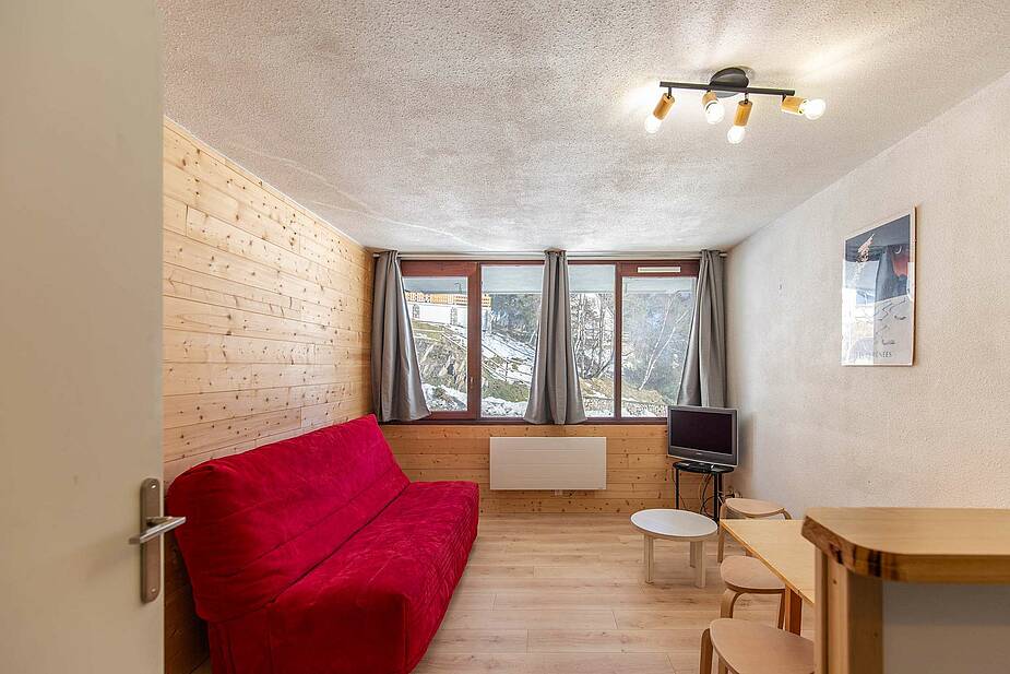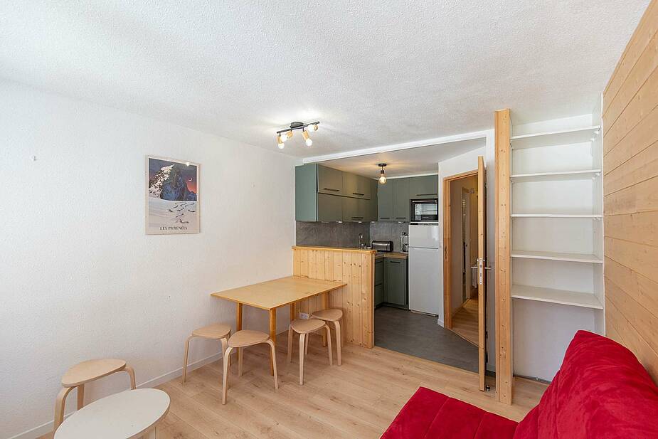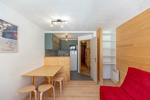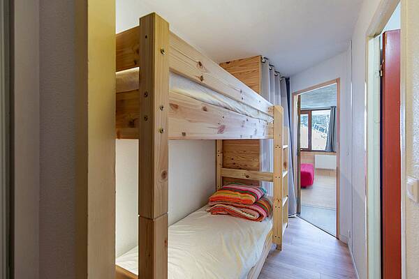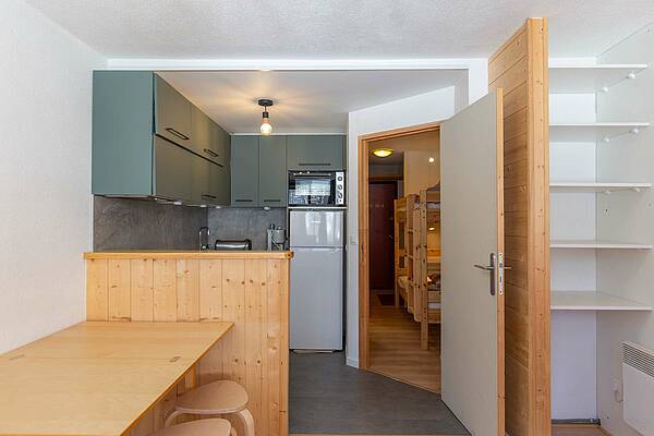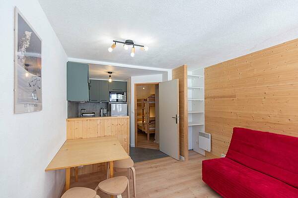 Séjour équipé d’une télévision, d’un canapé clic-clac deux personnes. Coin cabine avec deux lits superposés en 70cm. Sol PVC. Kitchenette ouverte sur séjour avec plaques à induction deux feux, micro-ondes, frigo 120 litres, grille-pain, cafetière à filtre.
