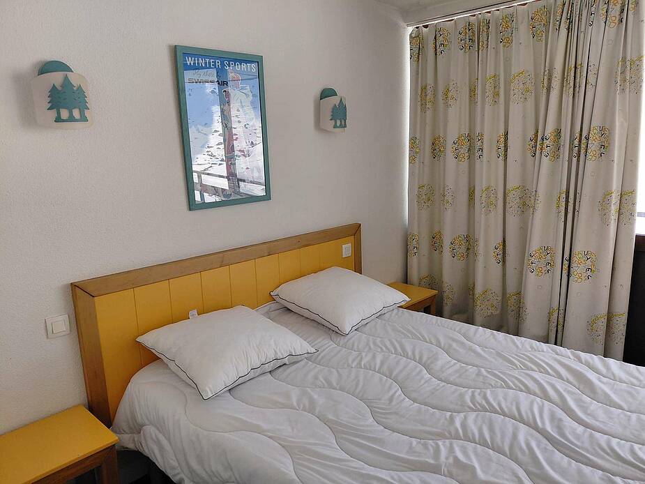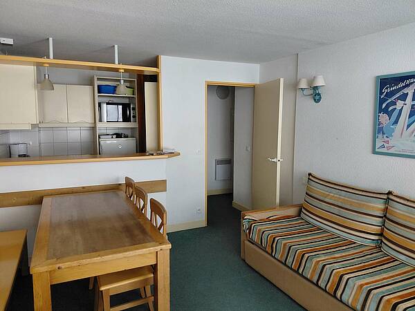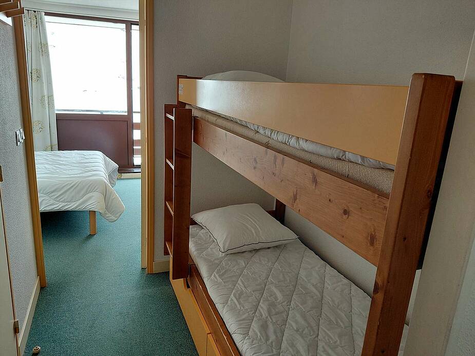 Situé au 9ème étage, balcon Sud avec vue sur les pistes. Séjour équipé d’une TV, d’un canapé lit pour deux personnes 2 X 90 CM, coin cabine avec lits superposés (2x90 cm) en entrée et une chambre avec lit en 140. Cuisine ouverte avec plaques vitro, micro-ondes multifonctions, lave-vaisselle, frigo 200 litres avec congélateur, grille pain, bouilloire, cafetière à filtre et appareil à raclette.