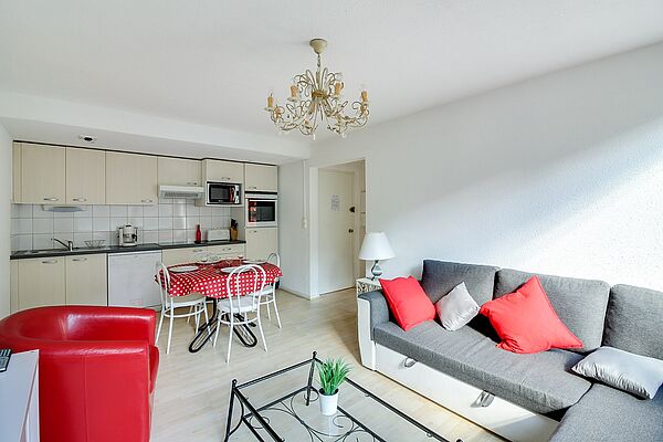 Appartement situé au 4ème étage avec ascenseur, surface de 40m² sans balcon et en exposition arrière immeuble (vue limitée). Séjour équipé d’une TV d’un canapé-lit deux personnes en 140. Coin cabine fermé avec deux lits superposés en 90cm, une chambre comprenant un lit pour 2 personnes en 140. Sol en parquet stratifié. Cuisine ouverte sur séjour, avec plaques induction 4 feux, micro-ondes, four électrique, lave-vaisselle, frigo 150 litres, grille pain, cafetière à filtre et nespresso, bouilloire et appareil à raclette.. Salle d’eau avec douche, lavabo doubles vasques. Toilettes séparées. Appartement non fumeur.Casier à ski en RDC.