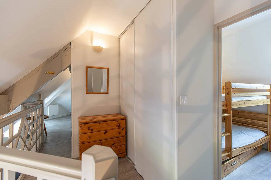 Duplex au 4ème étage, accès par escalier (3 étages). Surface de 60m² avec balcon Sud, face aux pistes. Séjour équipé d’un coin salon avec télévision. Cuisine ouverte sur coin repas entièrement équipée : lave vaisselle, réfrigérateur (table top), micro ondes, cafetière filtre, grille pain, bouilloire, auto cuiseur, service à raclette. en rdc : une chambre avec un lit en 140. A l'étage : une chambre avec 2 lits en 90 + un lit tiroir et une mezzanine avec un lit en 140 + 1 lit d'appoint pour un enfant. Deux salles d’eau avec douche et lavabo, un WC séparé. Sol en parquet stratifié.