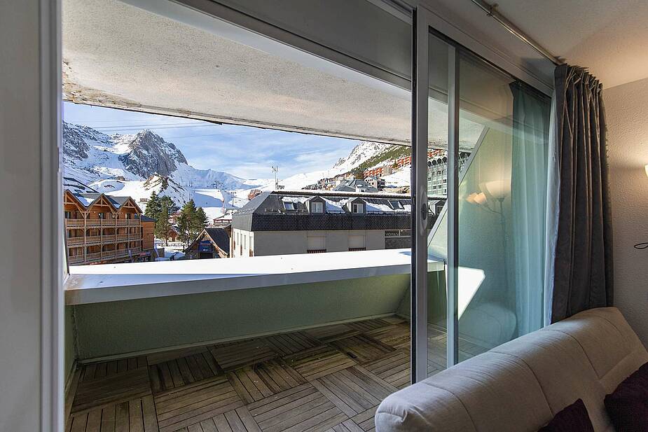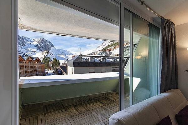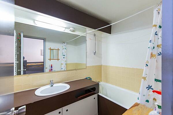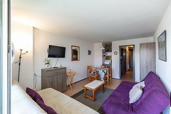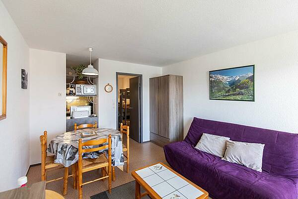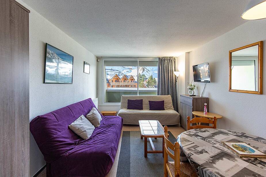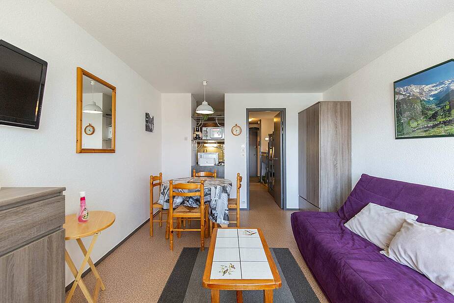 Studio situé au 2ème étage avec ascenseur, balcon, exposition Ouest (vue sur la station et les pistes). Séjour équipé d’une télévision, d’un canapé lit deux personnes et une banquette. Coin cabine avec trois lits superposés en 70cm.