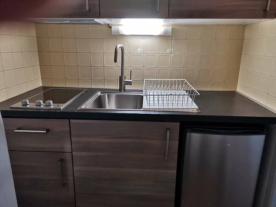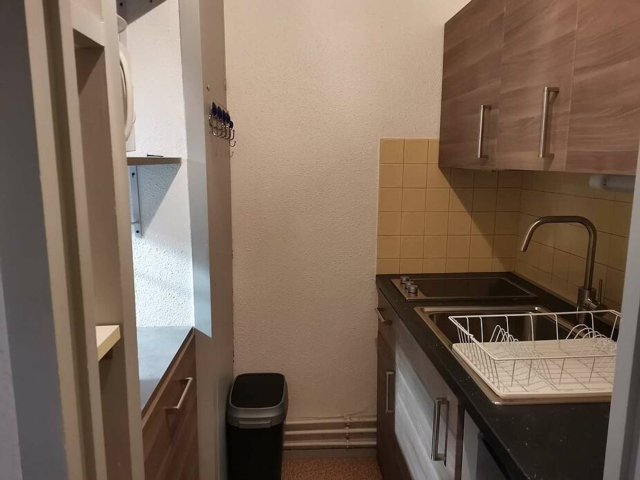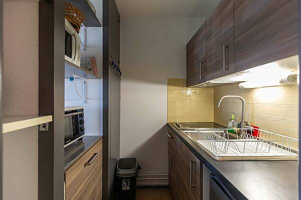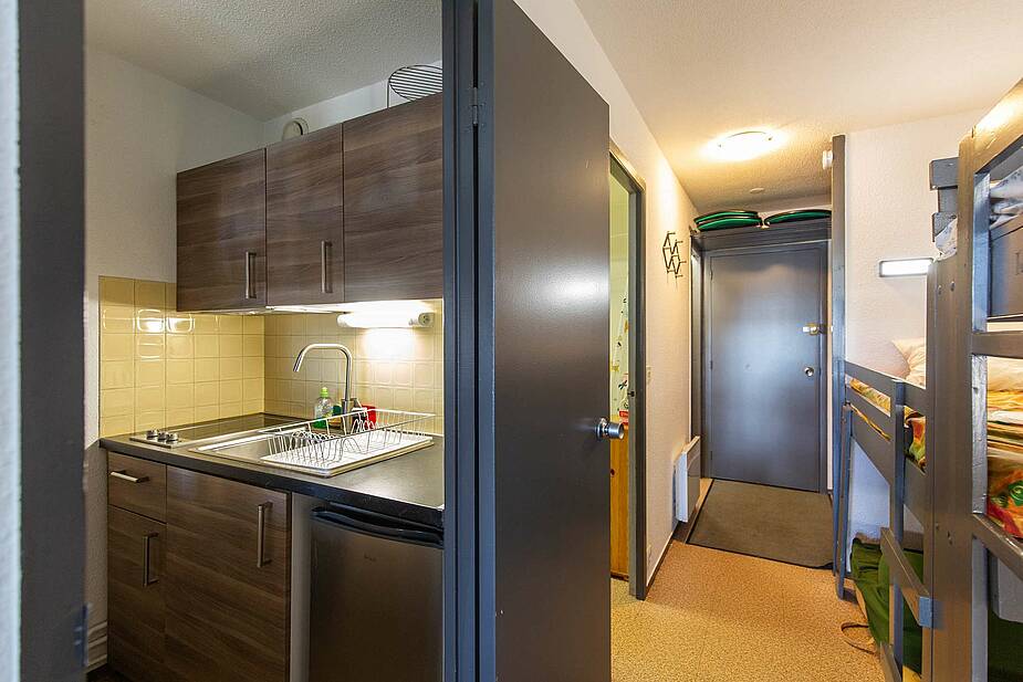 Kitchenette avec plaques électriques, micro-ondes, mini-four, frigo 120 litres, grille-pain, bouilloire et cafetière dolce gusto et filtre et appareil à raclette. Salle de bain et toilettes séparées. Sol PVC. Studio non fumeur. Casier à ski en RDC.