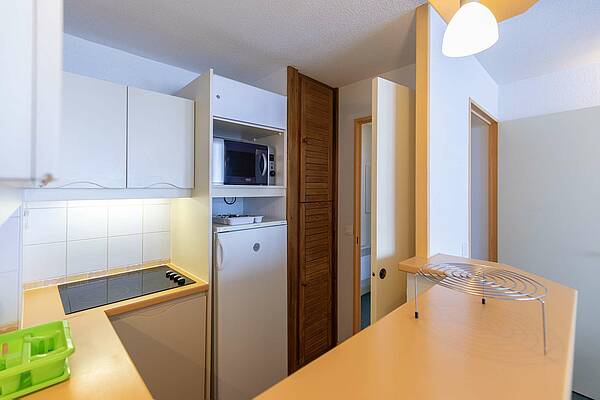 Situé au 7ème étage, balcon Sud avec vue sur les pistes. Séjour équipé d’une TV, d’un canapé lit pour deux personnes en 140, coin cabine avec lits superposés (2x90 cm) en entrée et une chambre avec lit en 140. Cuisine ouverte avec plaques vitro, micro-ondes multifonctions, lave-vaisselle, frigo 200 litres avec congélateur, grille pain, bouilloire, cafetière à filtre et appareil à raclette.