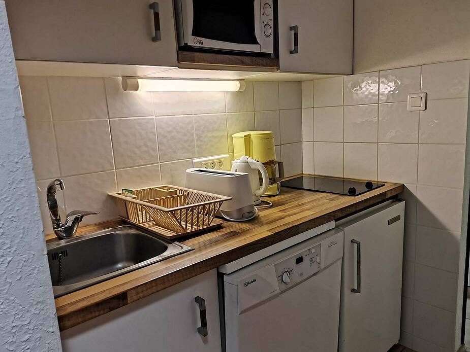 Studio situé au 3ème étage avec balcon, exposition sud, face aux pistes. Séjour équipé d’une TV, d’un lit 2 places en 140, une banquette en 90 et d’un lit BZ en 90 (ces deux couchages simples conviennent à des enfants). Moquette au sol. Kitchenette ouverte dans l’entrée, avec 2 plaques vitro-céramique, four micro-ondes, frigo 110 litres, lave vaisselle, cafetière à filtre. Salle de bain comprenant : baignoire, lavabo et toilettes. Casier à ski en face du studio. Studio non fumeur.
