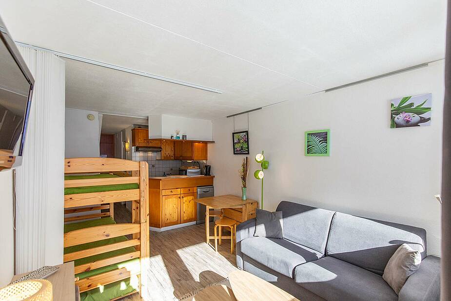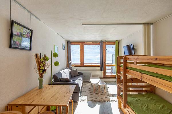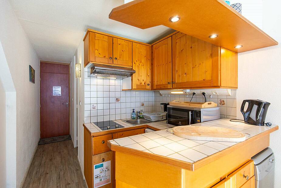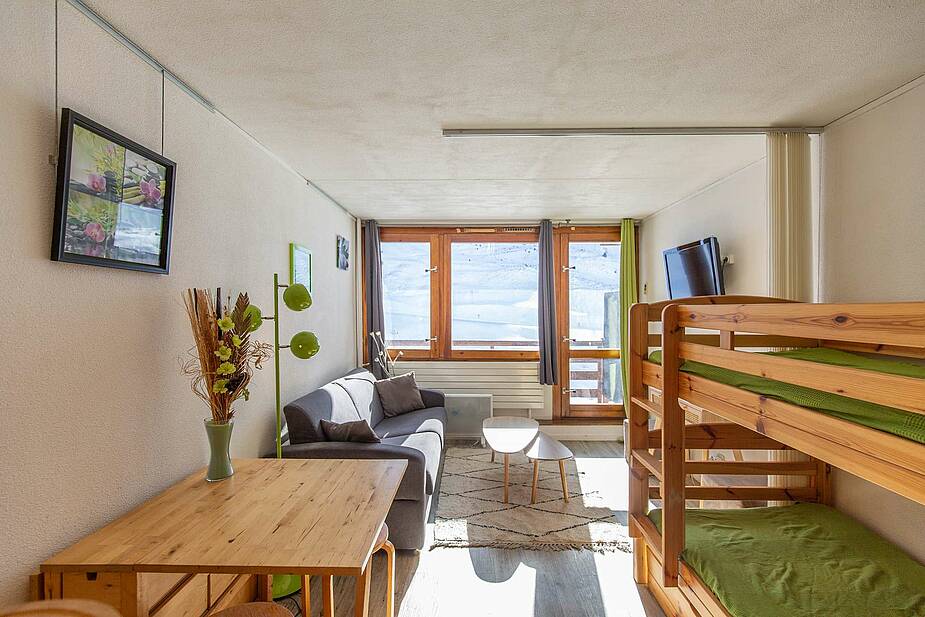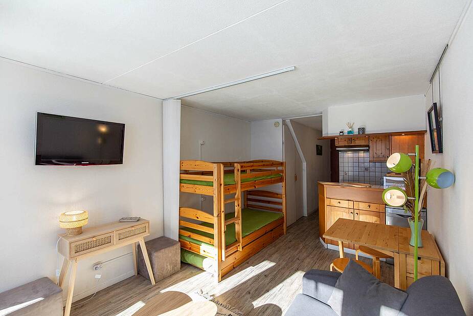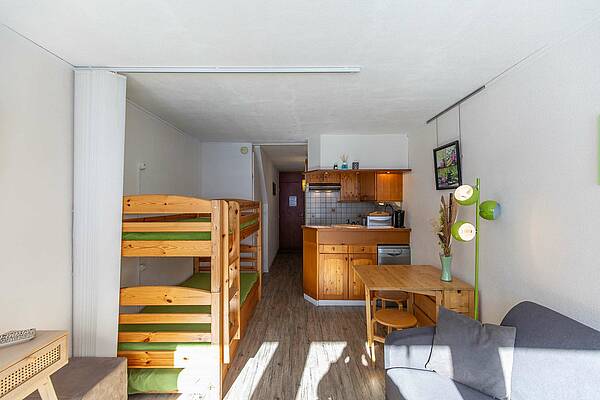 Studio de 23 m² situé au 6ème étage, avec balcon exposition sud face aux montagnes. Séjour équipé d’un téléviseur, d’un canapé lit et de lits superposés en 90. Kitchenette ouverte sur séjour avec 2 plaques électriques, micro-ondes multifonctions, réfrigérateur, cafetière, grille pain, bouilloire, lave vaisselle. Salle de bain comprenant : baignoire, lavabo et toilettes. Parquet au sol. Studio non fumeur. Casier à ski en face du studio.