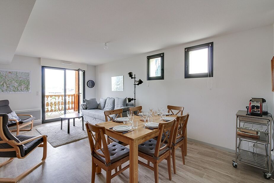 Au 3ème étage d’une résidence de standing et sécurisée avec ascenseur, appartement d'une surface de 70 m² avec terrasse exposition sud ouest et vue sur la station. Séjour de 35 m² avec TV et un canapé lit 2 places . Cuisine ouverte sur coin repas avec lave vaisselle, lave-linge, réfrigérateur congélateur, micro ondes, four cafetière nespresso et filtre, grille pain, bouilloire et appareil à raclette. Salle de bain et toilettes séparées. Sol en parquet stratifié. Appartement non fumeur. Casier à ski en RDC.