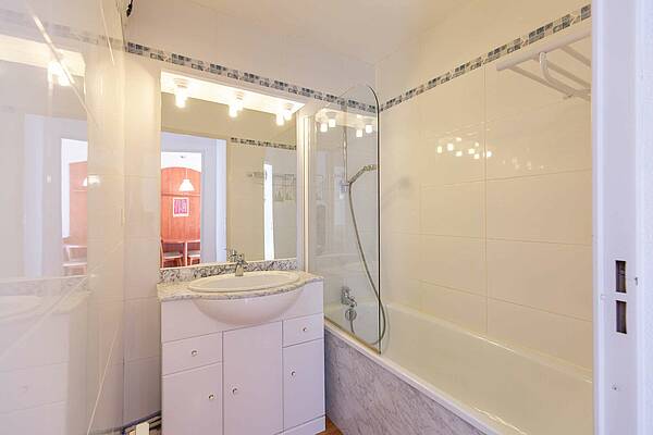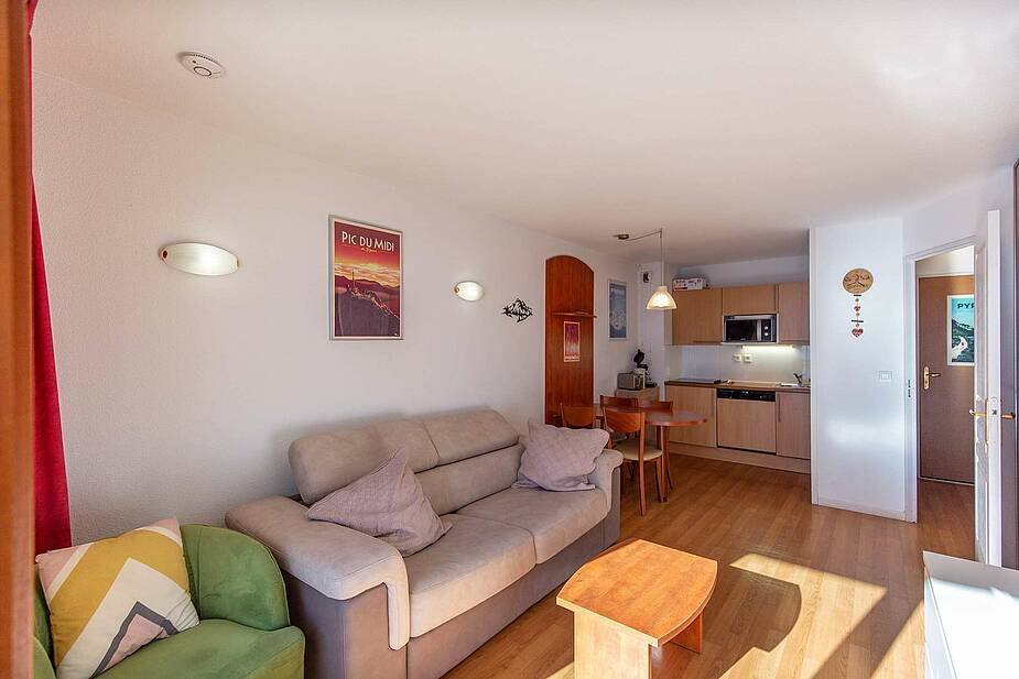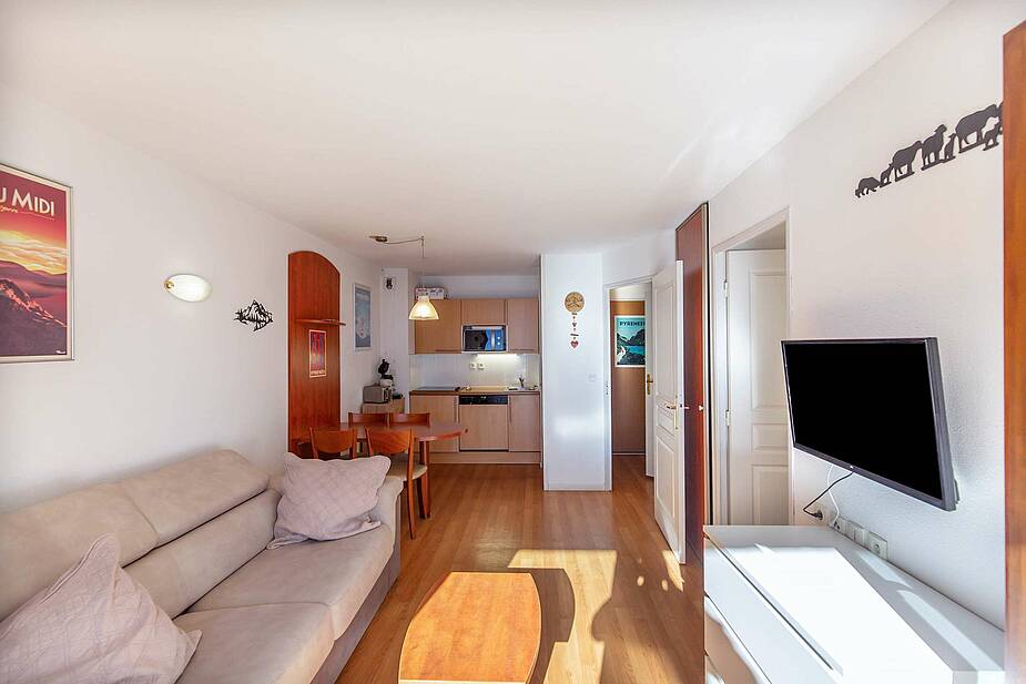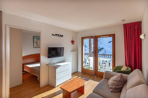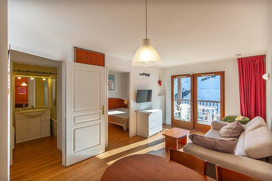 Appartement 2 pièces 4 couchages situé au 2ème étage sans ascenseur, surface de 33 m² avec terrasse, exposition sud. Séjour équipé d'un canapé lit en 160 (2x80), coin repas, téléviseur. Chambre avec un lit en 160. Coin cuisine dans séjour avec plaques vitro céramiques, micro-ondes multifonctions, cafetière à filtre et Senséo, bouilloire, lave vaisselle, grille pain et appareil à raclette. Salle de bain et toilettes séparées. Sol en lino. Appartement non fumeur. Casier à ski. Parking couvert.