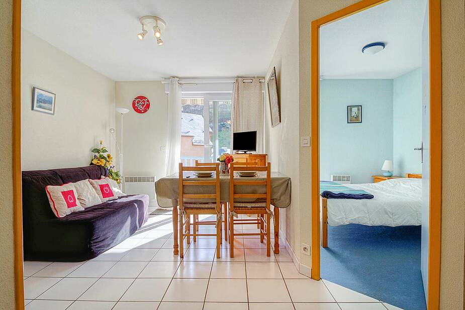 Entrée, séjour avec canapé convertible 2 personnes, télévision, une chambre avec un lit 140, un coin cabine avec deux lits superposés en 90, une kitchenette équipée avec lave-linge, micro-ondes, four, réfrigérateur top, 4 plaques électriques, cafetière. Une salle d’eau et WC séparés.