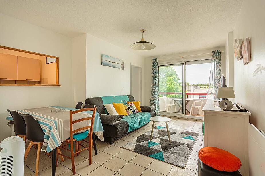 Ce bien est composé d'une pièce à vivre avec un canapé lit en 130, d'une salle à manger donnant sur un balcon , ainsi que d'une cuisine ouverte entièrement équipée