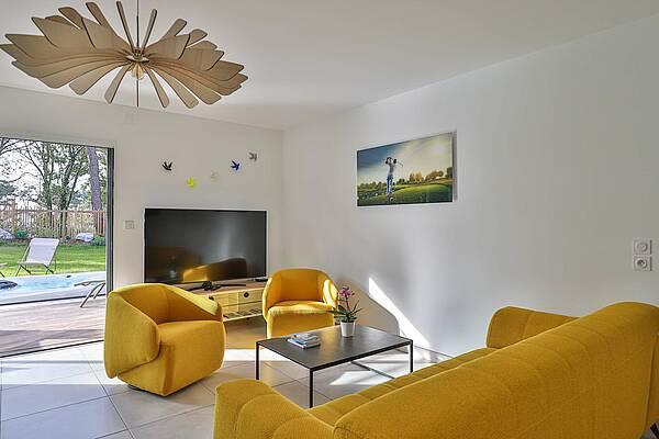 Ce bien dispose d’une entrée avec rangements et d'un WC indépendant avec lave mains. La grande pièce à vivre lumineuse donne un accès direct sur la terrasse de 40m2 et sur un jardin de 260 m2, elle comprend un séjour avec canapé et fauteuils, une TV connectée, une table confortable pour vos repas et une cuisine entièrement équipée.