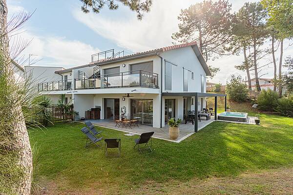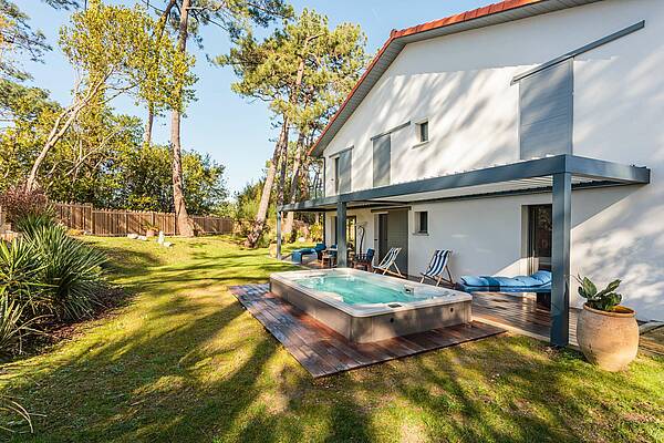Vous serez séduit par sa terrasse aménagée couverte de 18m2 avec une table 6 personnes et d'une terrasse avec pergola bioclimatique de 30m2 donnant sur le spa de nage (jacuzzi) et d'une douche extérieure, ainsi qu'un espace repas et d'une plancha permettant de profiter pleinement des extérieurs.