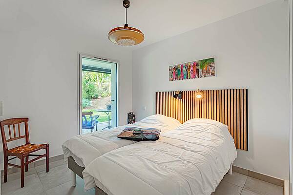 Le coin nuit offre 2 chambres avec deux grand lit avec accès direct sur la terrasse, ainsi qu'une chambre avec deux petits lits superposés et deux salles d'eau.