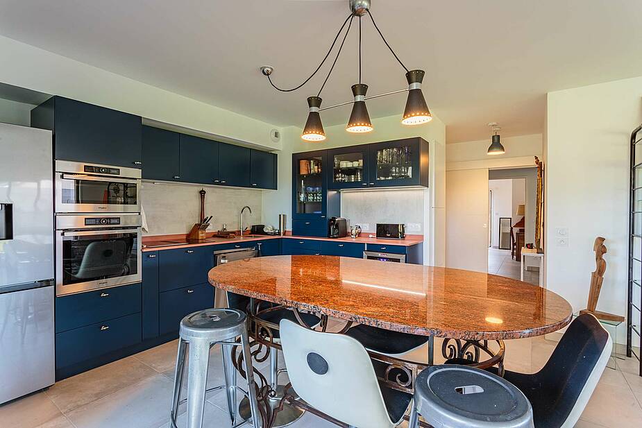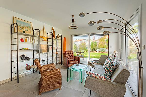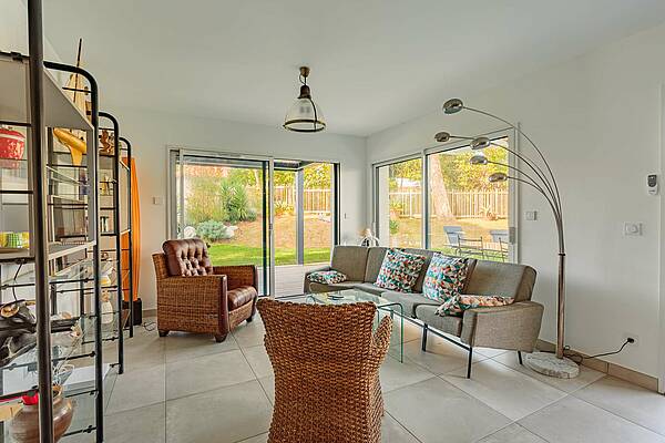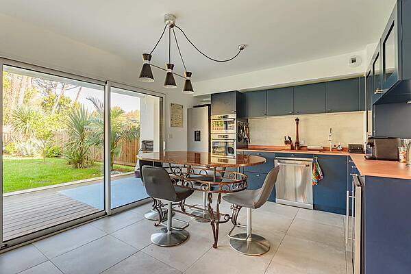 Il dispose d'une grande pièce à vivre lumineuse avec coin salon et salle à manger, ainsi que d'une cuisine ouverte équipée avec un accès direct sur la terrasse et le jardin.