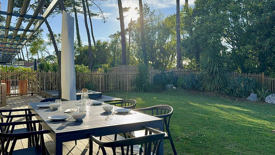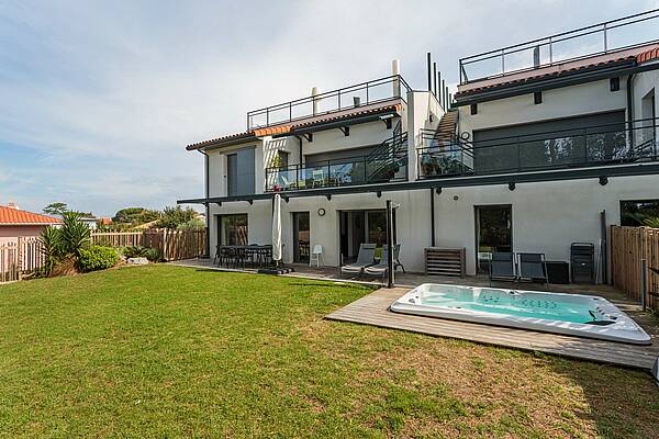 La terrasse aménagée avec un grand spa (jacuzzi), un espace repas et une plancha permet de profiter pleinement des extérieurs.