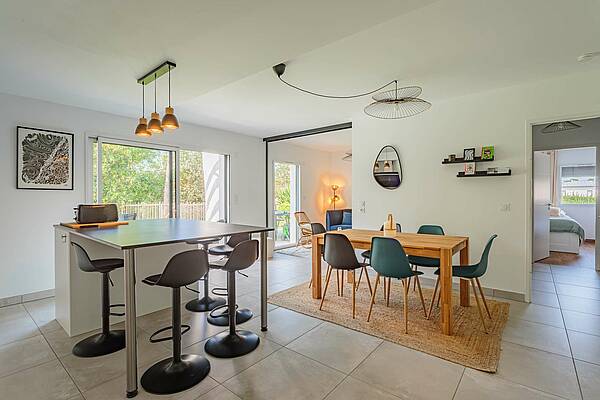 Ce bien dispose d'une grande pièce à vivre lumineuse avec un coin repas et cuisine ouverte équipée ainsi que d'un salon , le tout donnant sur la terrasse et le jardin.