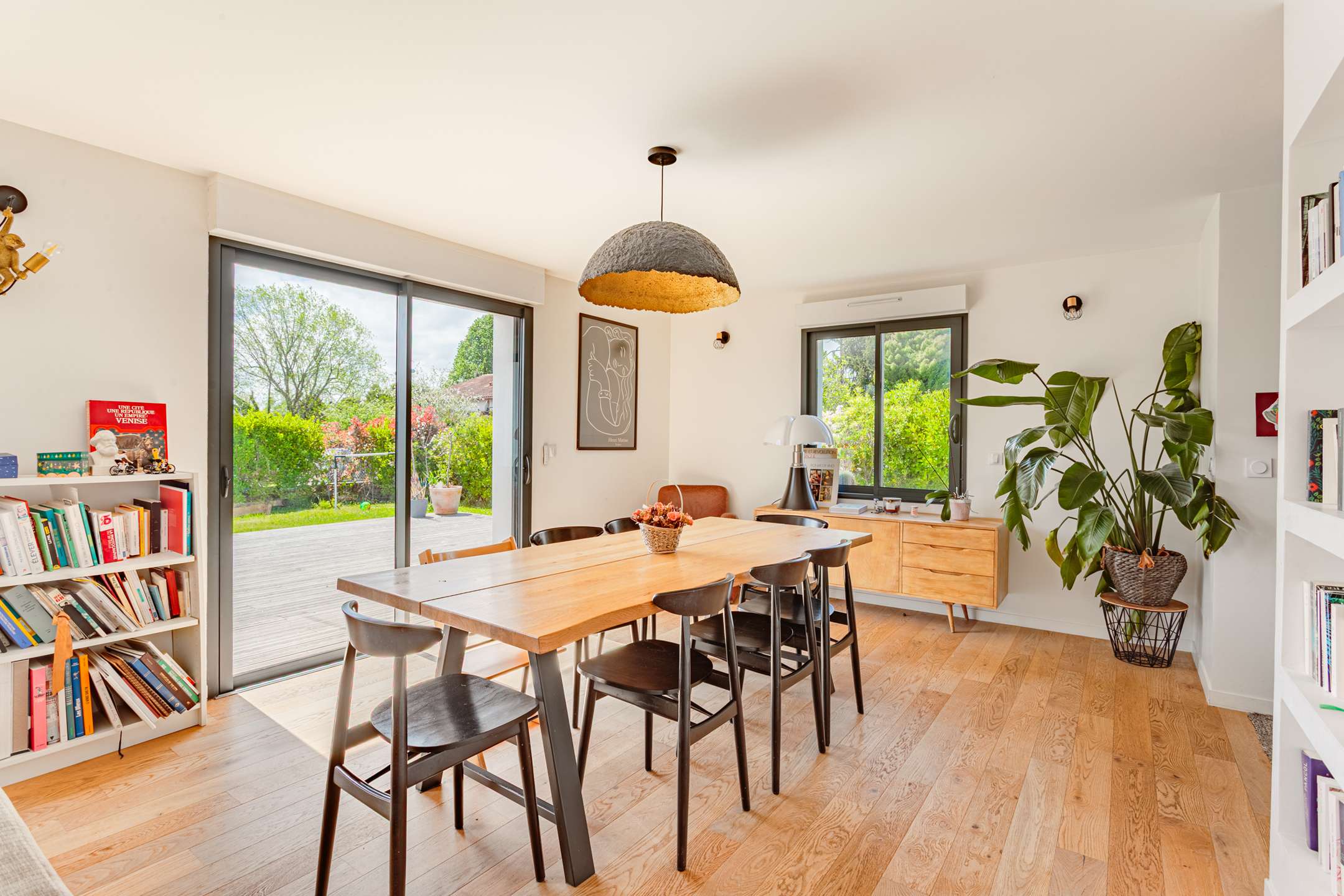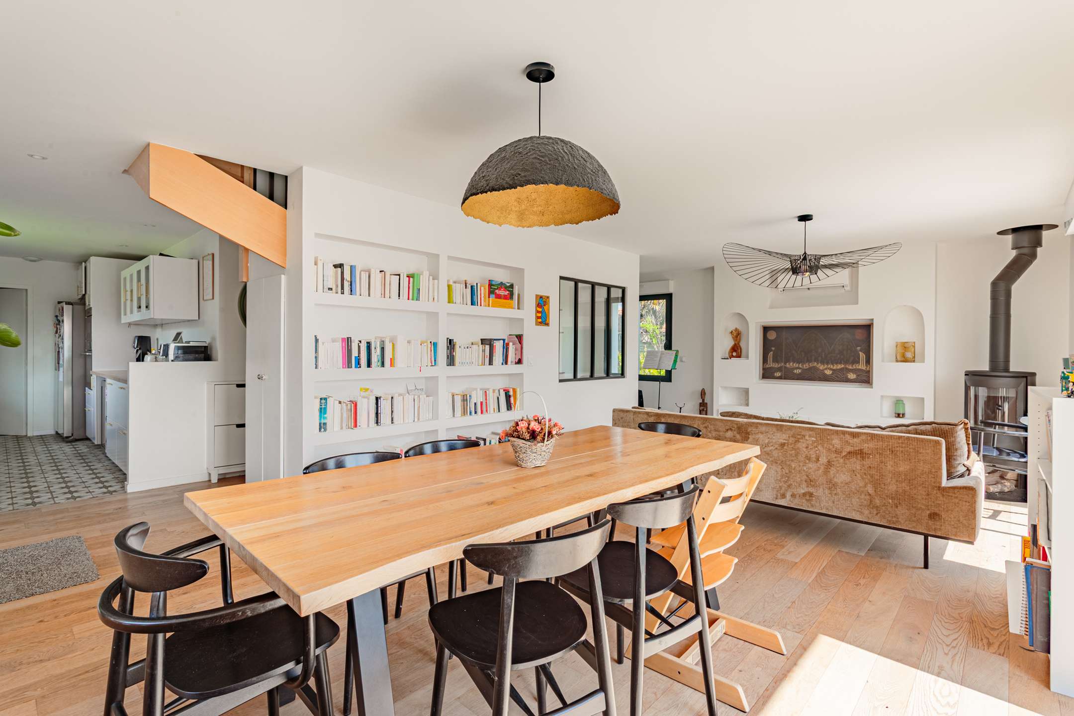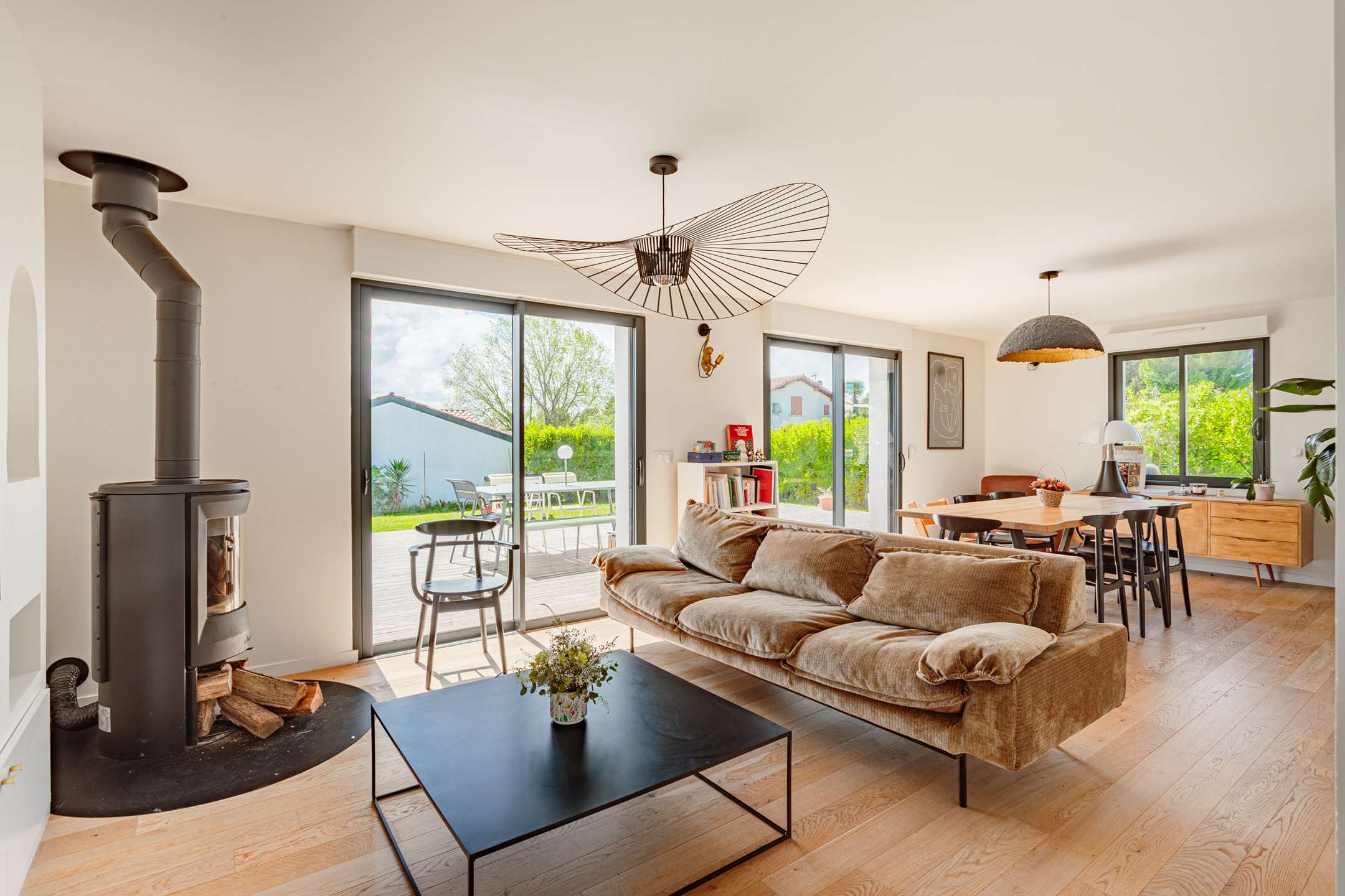 La maison, aux beaux volumes, se compose au rez-de-chaussée d’un vaste espace de vie avec salon, salle à manger et cuisine ouverte entièrement équipée, donnant directement sur une agréable terrasse et un grand jardin, parfait pour profiter des beaux jours.