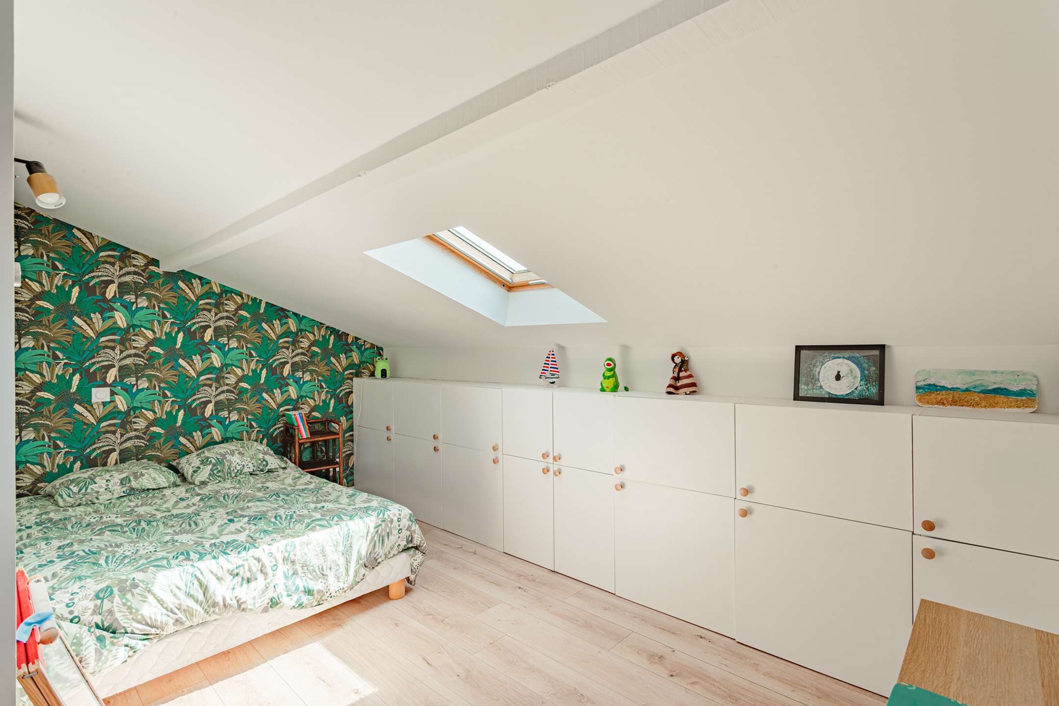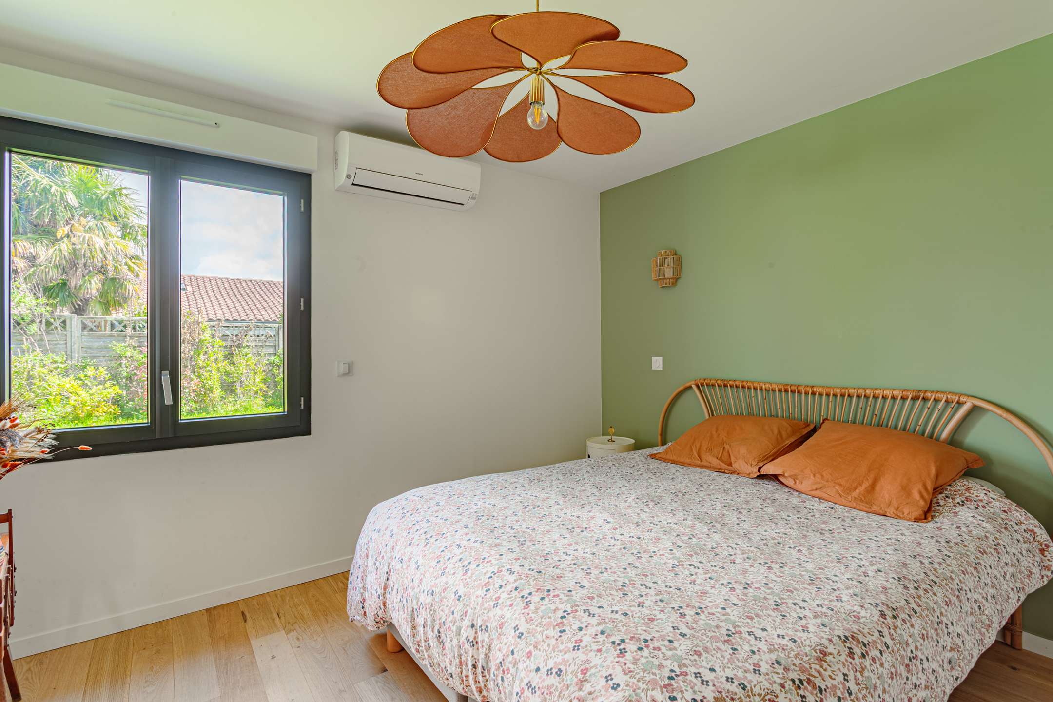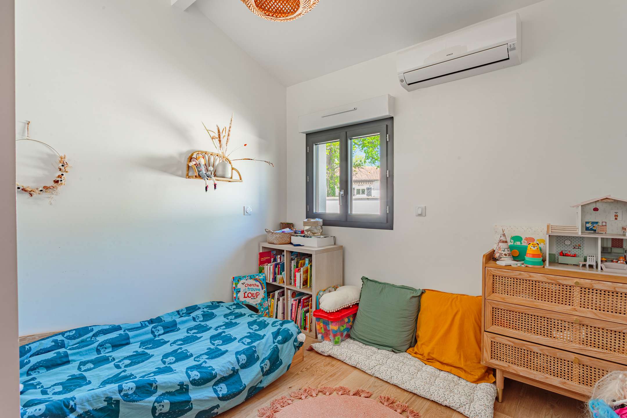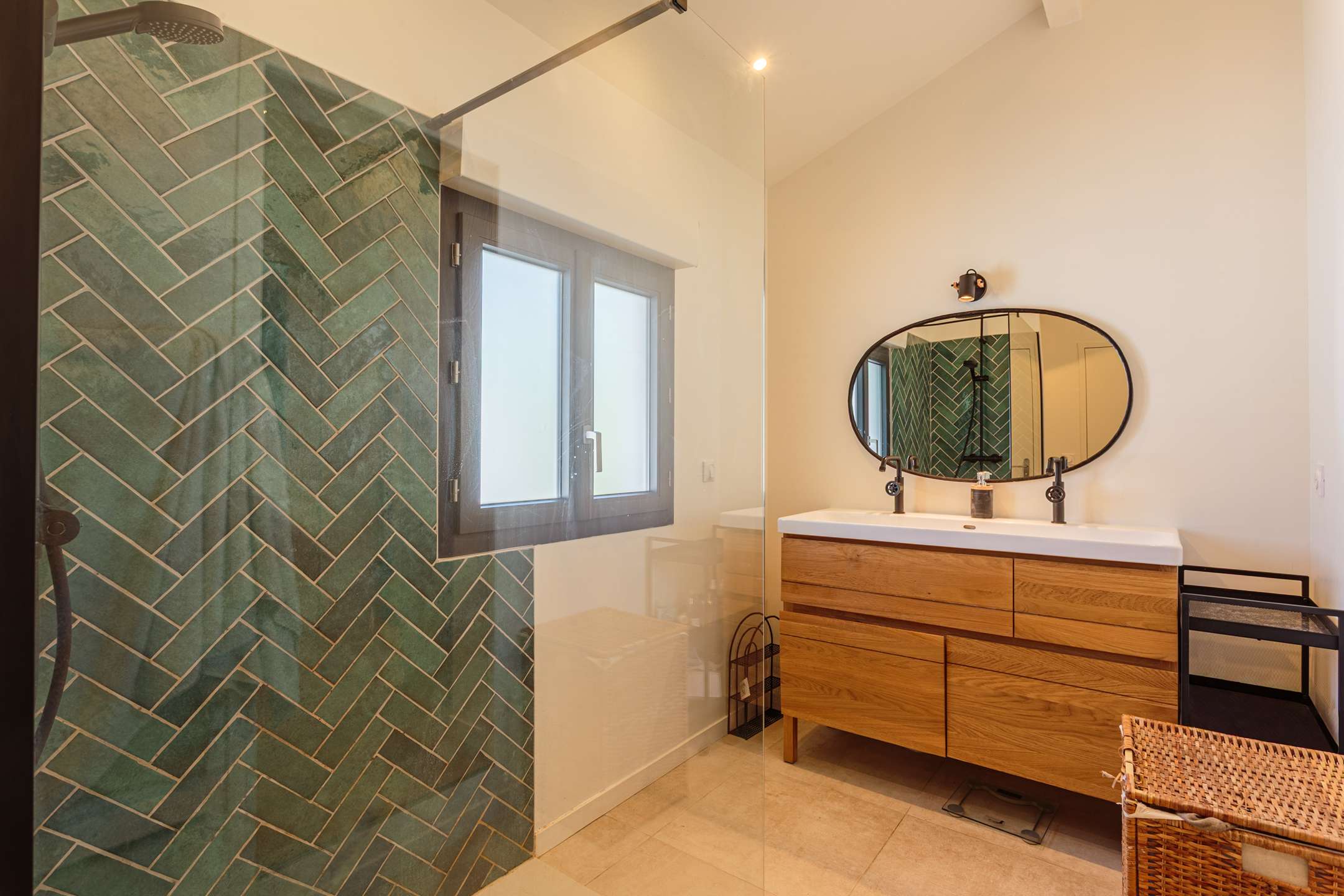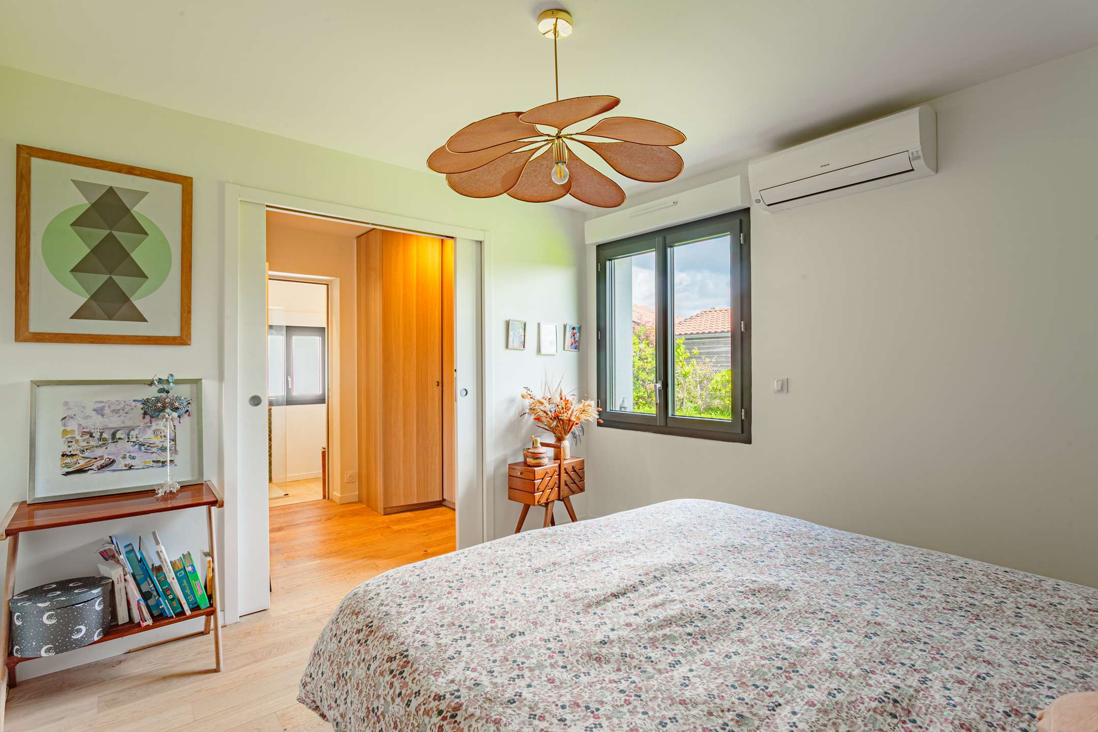 Toujours au rez-de-chaussée, l’espace nuit propose deux chambres, une suite parentale avec lit en 160, une chambre enfant avec lit en 90, ainsi qu’une salle d’eau traversante.
