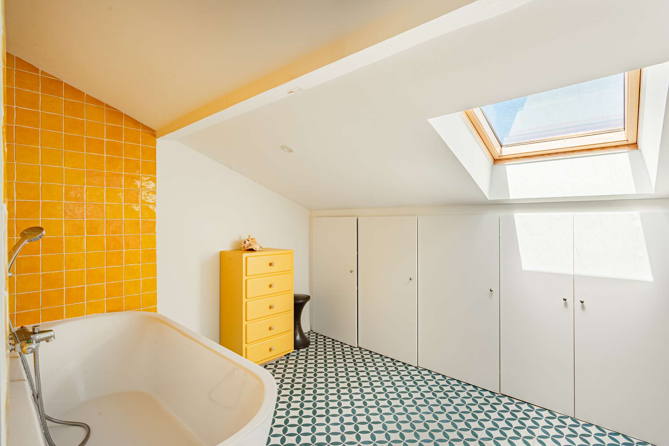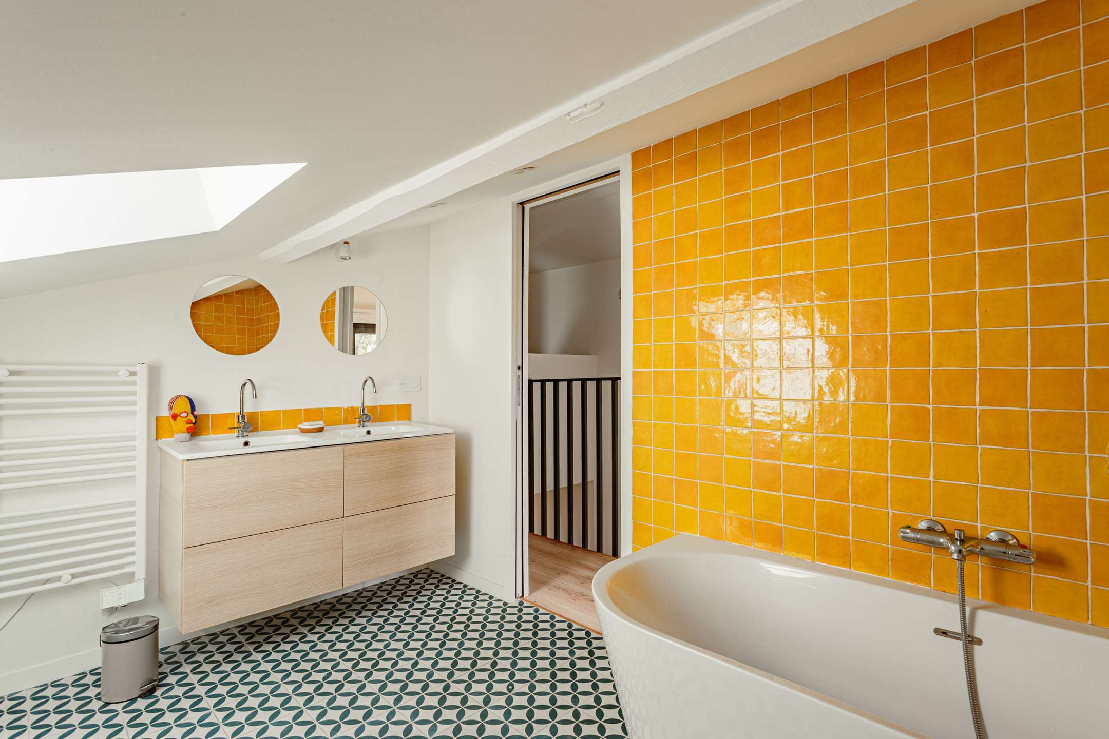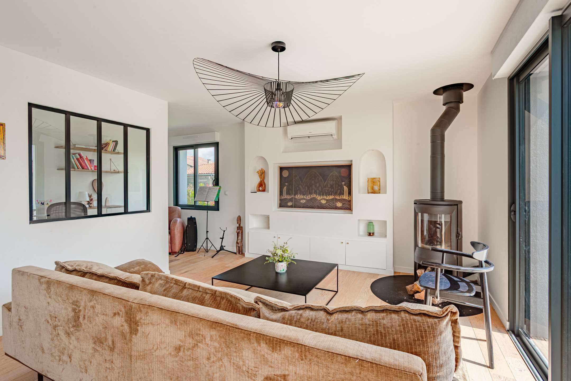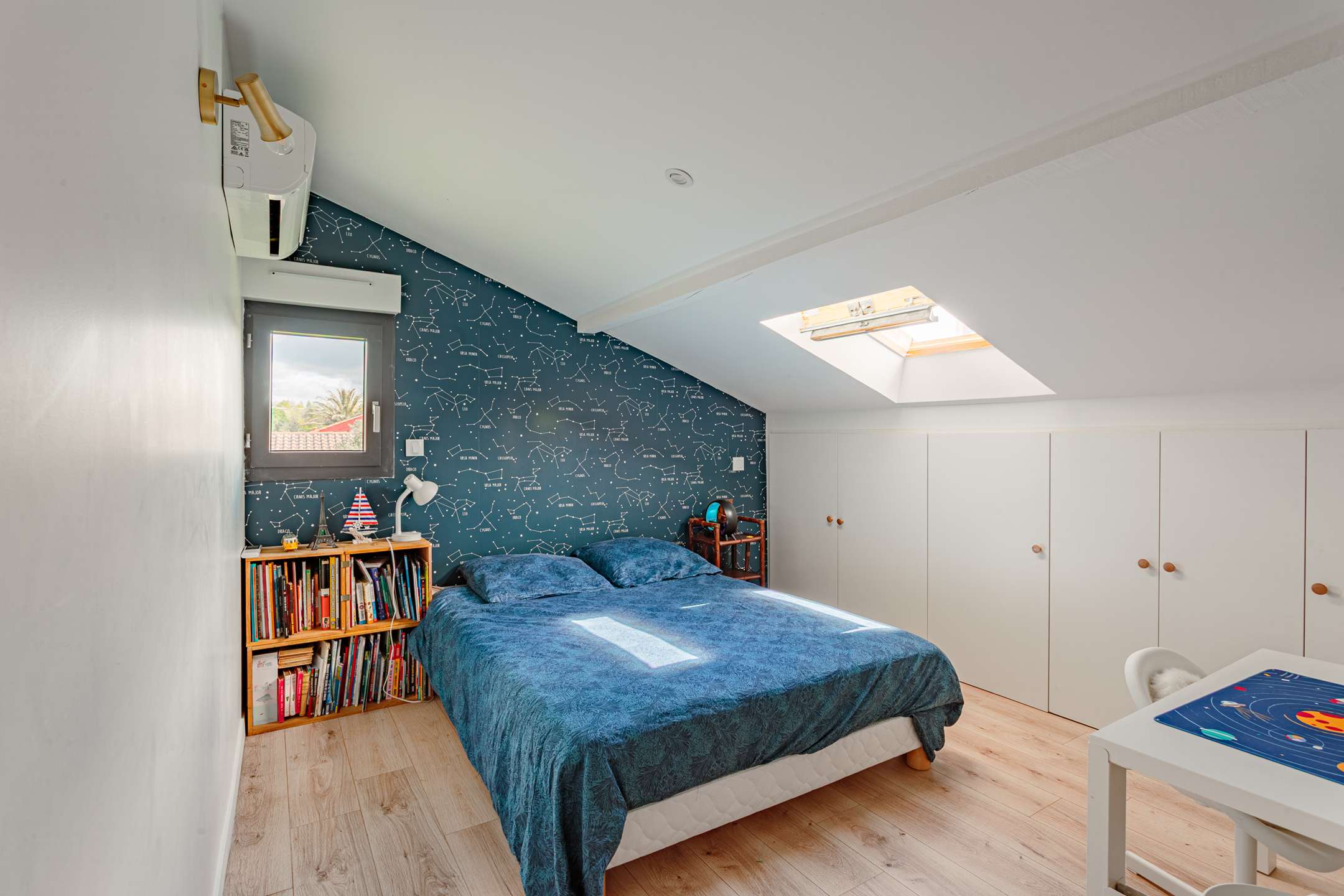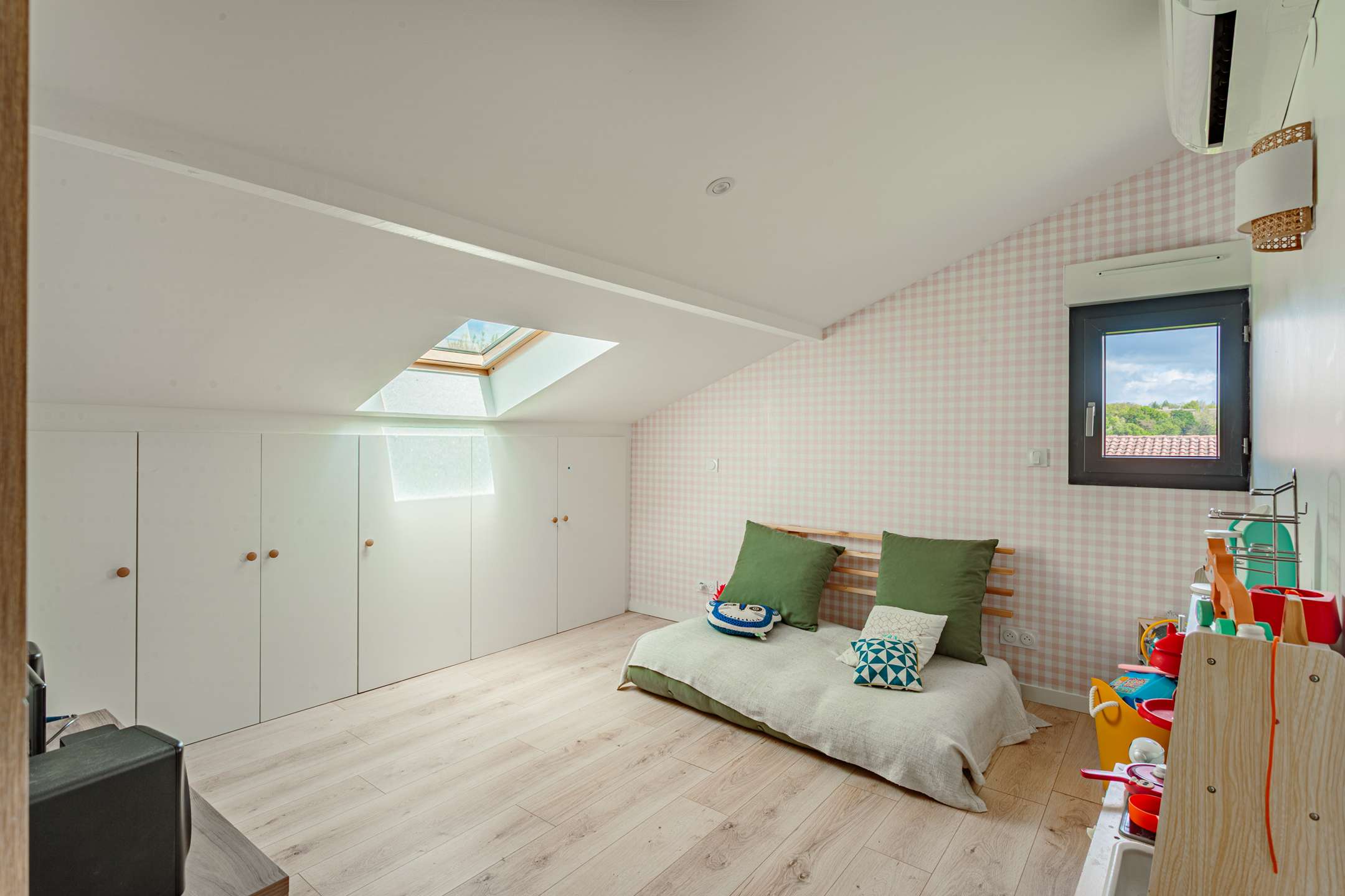 Toujours au rez-de-chaussée, l’espace nuit propose deux chambres, une suite parentale avec lit en 160, une chambre enfant avec lit en 90, ainsi qu’une salle d’eau traversante.
