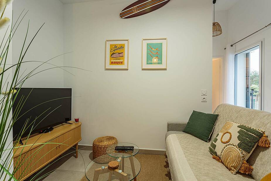 Il dispose d'une pièce à vivre avec une belle hauteur sous plafond ouvrant sur la terrasse avec un espace salon comprenant un canapé lit en 140, une table pour vos repas et une cuisine équipée.