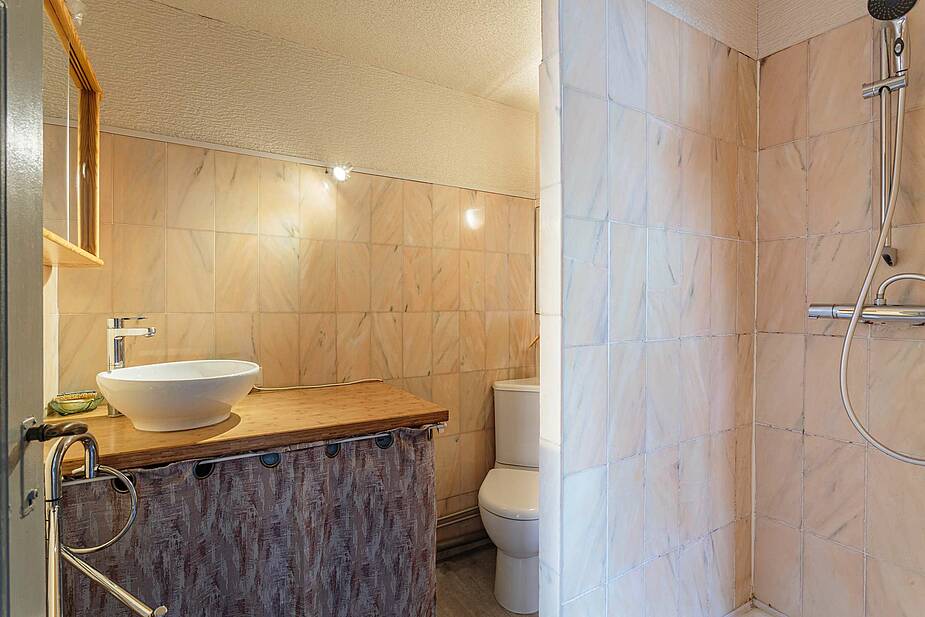 Au premier niveau, il se compose d'une belle pièce de vie avec coin salon et coin repas, d'une cuisine ouverte tout équipée, ainsi que d'une salle d'eau avec WC.