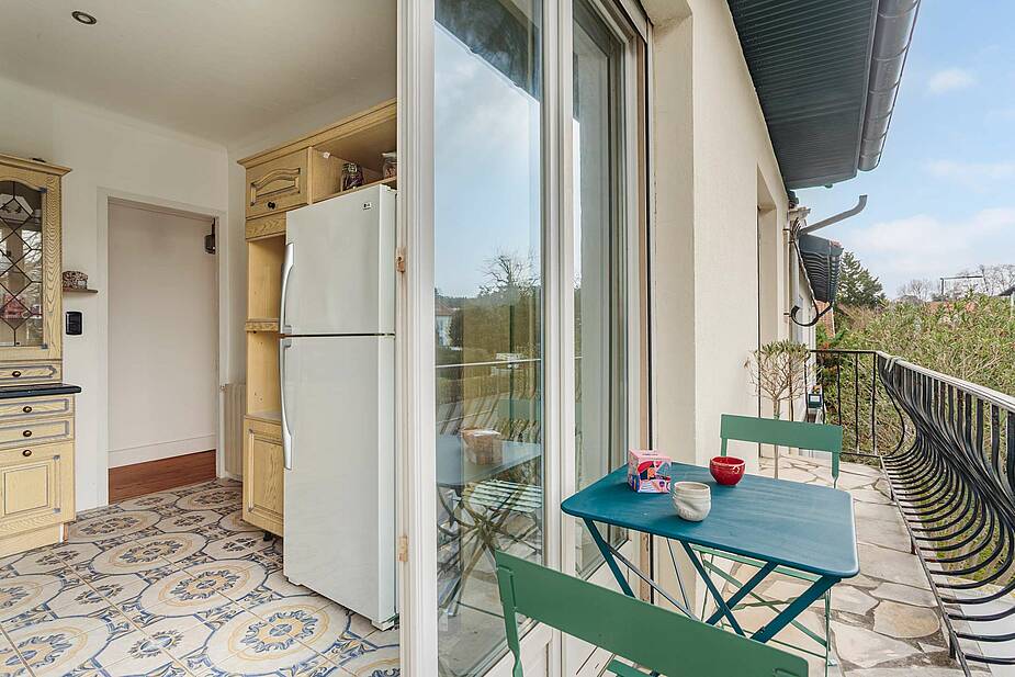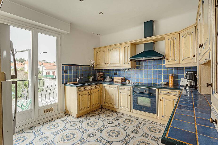 La cuisine fermée, entièrement équipée, offre également un accès direct au balcon.