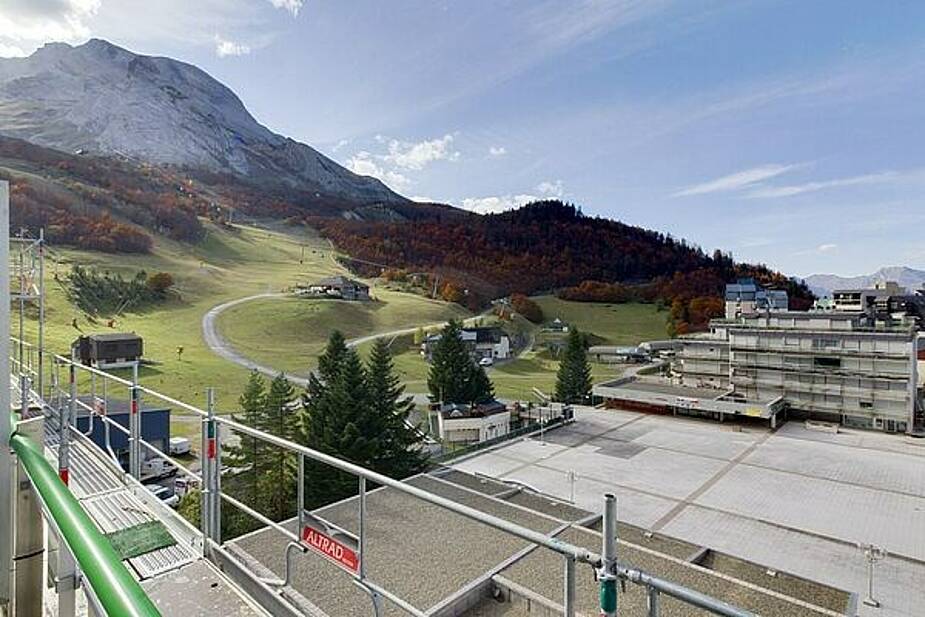 Vue du balcon sur la montagne et les pistes. Donnant sur l'esplanade du Valentin, il peut y avoir des nuisances sonores en pleine saison d'hiver (au dessus de bars).