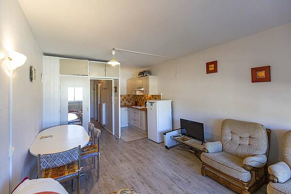 Grand séjour avec canapé BZ pour 2 personnes, une télévision, deux fauteuils ainsi qu'un coin repas.